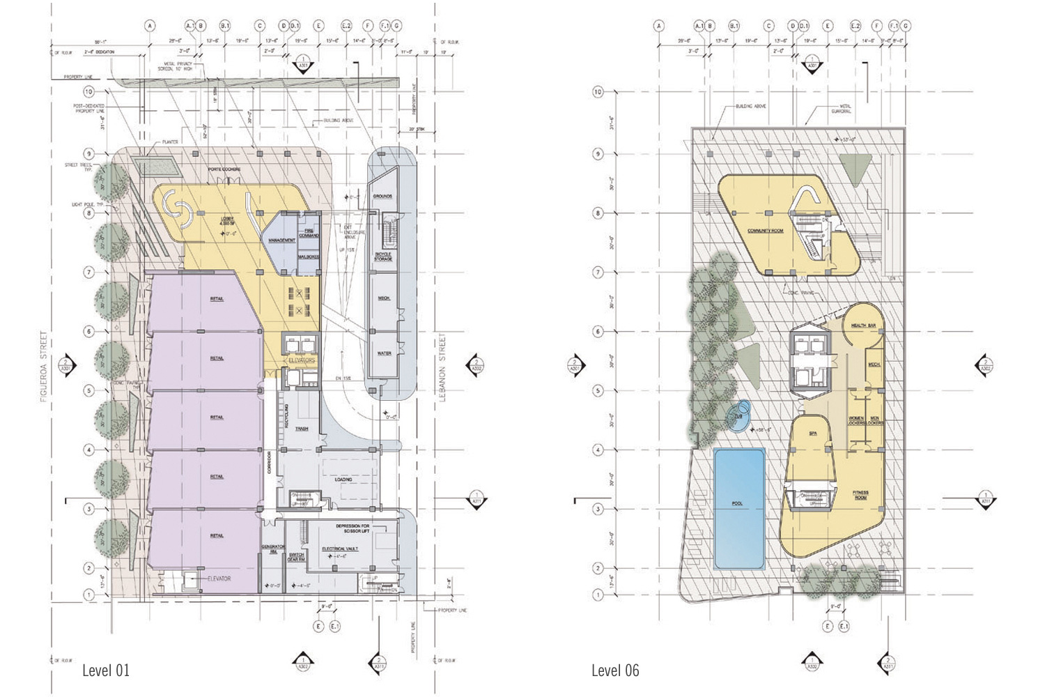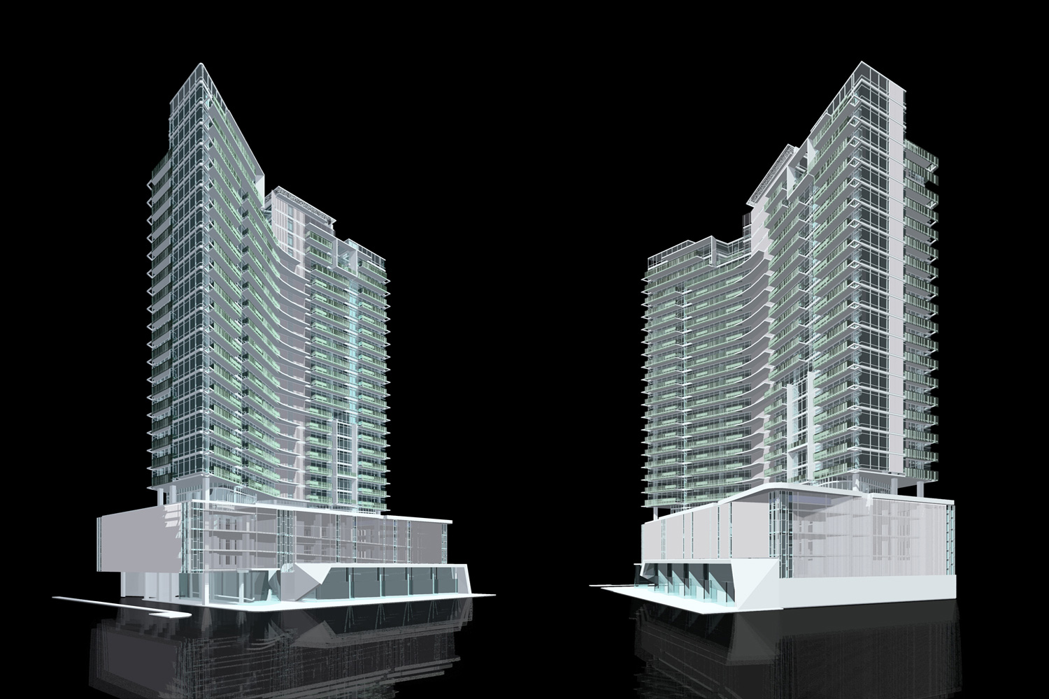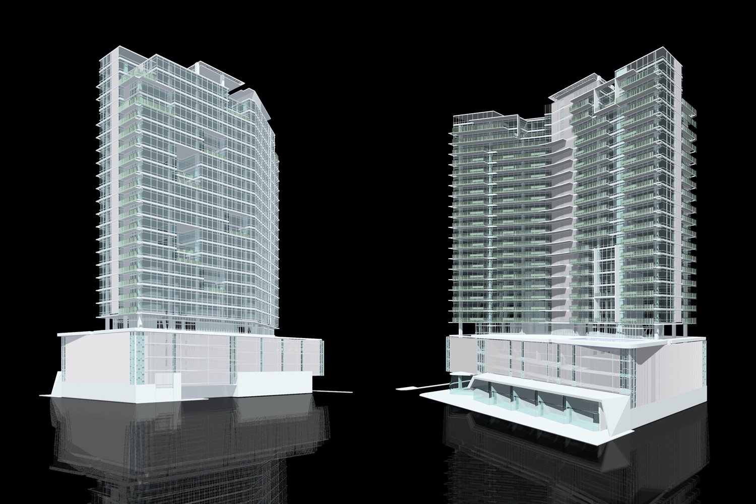 The design features 195 residences comprised of one and two bedroom units, two floors of penthouses with private terraces, and structured parking for 312 vehicles. A strategically shaped 19 story tower rises above an integrated five level podium comprised of at-grade residential lobby, commercial space, and four levels of parking. The podium deck contains residential amenities, including a pool, spa area, cantilevered sundeck, fitness center, and meeting rooms. The spacious ground floor lobby will feature concierge service and 9500 sf of specialty shops and cafes.