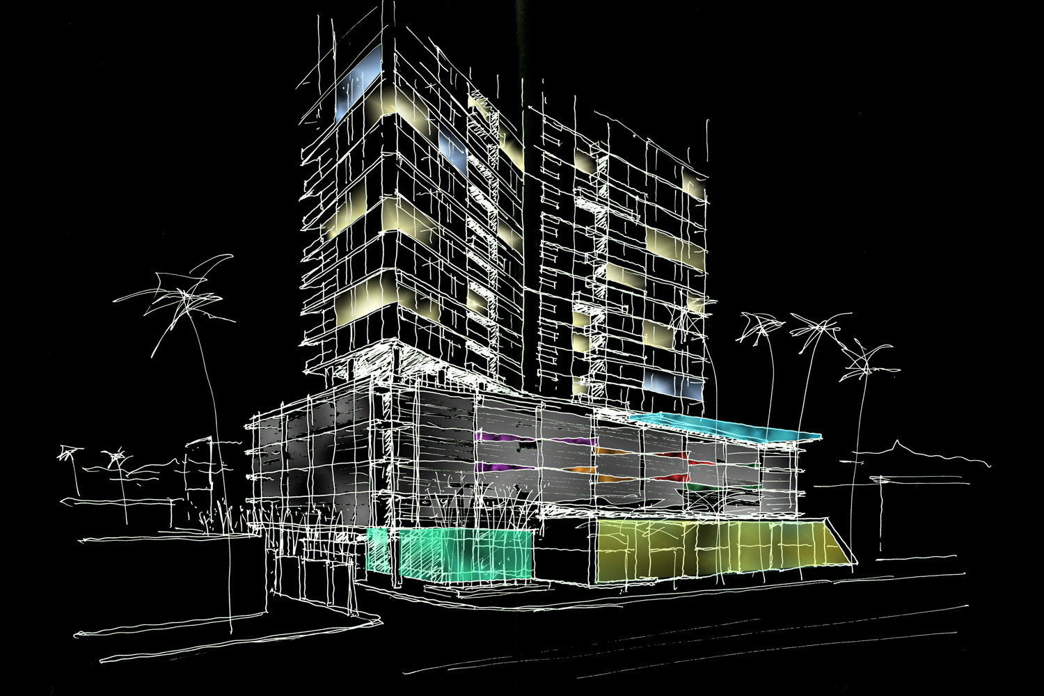 The angled tower form responds to the unique urban condition, as the site is immediately visible and directly on axis when approaching downtown from the I-10 Santa Monica Freeway. The geometry additionally provides enhanced views of downtown LA, the mountains to the northeast, and southwesterly views towards the ocean. The project is designed to achieve LEED Silver certification, with several key features such as sky gardens and extensive rain water harvesting figuring prominently in the sustainable approach.