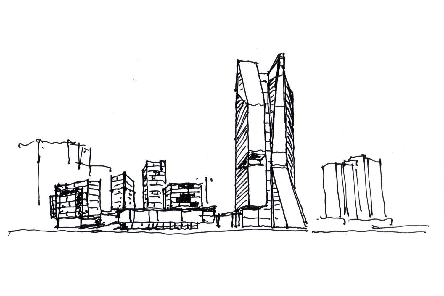 The design concept maximizes the potential for views and orientation by optimizing shape and placement of buildings. An offset office plan, sky-lobbies, and sculpted form provide views through the building, while heightening transparency. Residential program is dispersed amongst multiple buildings of varying heights, creating spatial definition and view corridors. Avoiding the typology of a monolithic retail podium, a meandering enclosure promotes pedestrian experiences, opening the landscaped center for public use and extensive landscaping.