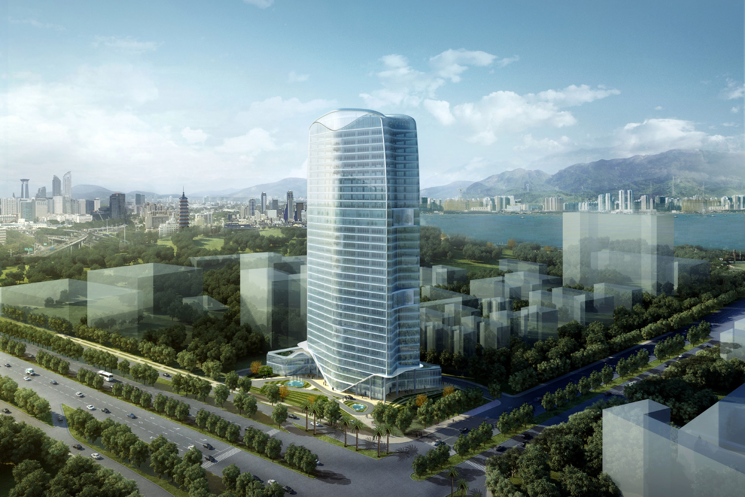 The tower and podium design solution responds to these influences by creating distinct and inviting pedestrian linkages, and to visually establish its pivotal urban location. A beautifully sculpted tower shape responds directly to the urban context and geometry, and overcomes the setback and envelope restrictions. A desired result of the tower's form is the preservation and enhancement of the view corridor towards the Garden Expo Pagoda Tower when traveling east along QiaoXiang Lu. While architecturally responsive to context, the tower shape and floor plan is also derived from the goal of providing the highest quality Class A office space. A highly efficient floor plan seamlessly integrates unique office environment amenities and advantageous view opportunities.