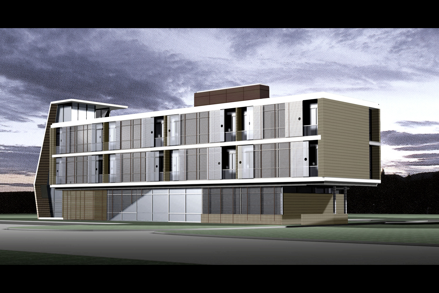 External materials consist primarily of horizontal wood siding, wood veneer panels, and a clever wood screening over larger glazed openings. This provides privacy and sun shading for the hotel guests and presents a unique glowing effect externally at nighttime, similar to Asian lanterns. The western façade of the guest wing consists of wood screens and operable, matted glass panels that can be individually moved by the guests to provide privacy, shading, or an open exposure. This provides a continuously changing, expressive façade to the public, and a distinct signature for the hotel property.