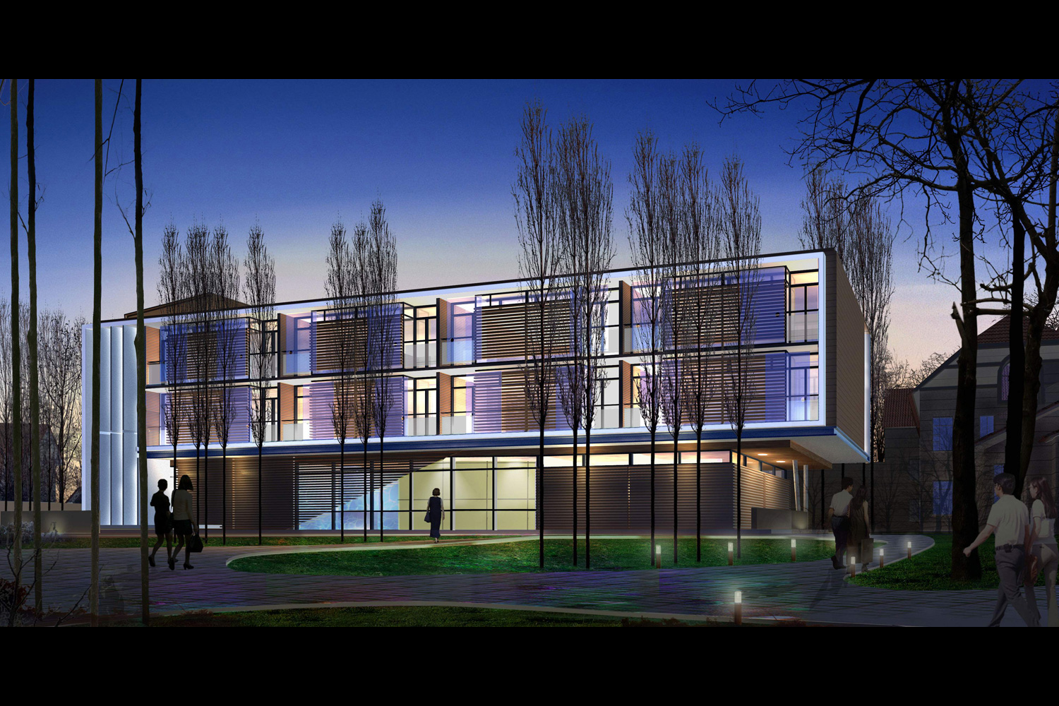 Working within the boundaries of a demanding site, the project establishes a public and private realm through thoughtful siting and placement of building forms and uses. The massing strategy consists of two offset wings separated by a transparent public circulation zone. Set at opposing angles, the building wings respond to the site boundary and neighboring structures, while forming a private courtyard. The three story western wing consists of guest rooms set above ground level spa treatment and rejuvenating pool amenities. This wing runs parallel with the site boundary, positioning single-loaded guest rooms to enjoy views of the Town Hall and the bend of Lielupe River.