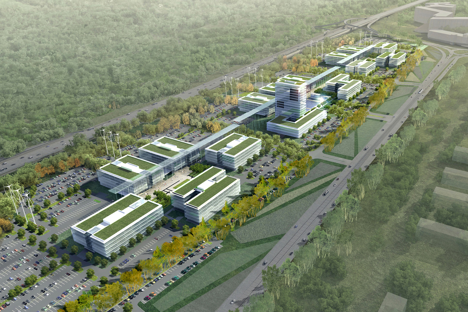 Located 20 km southwest of central Moscow, the business park provides an innovative workplace environment uniquely positioned to capitalize on the dynamic growth of the capital city. The design concept promotes a vibrant business community offering highly flexible class A office space, with support and public amenities creating a meaningful realm embracing nature and encouraging social activities.
