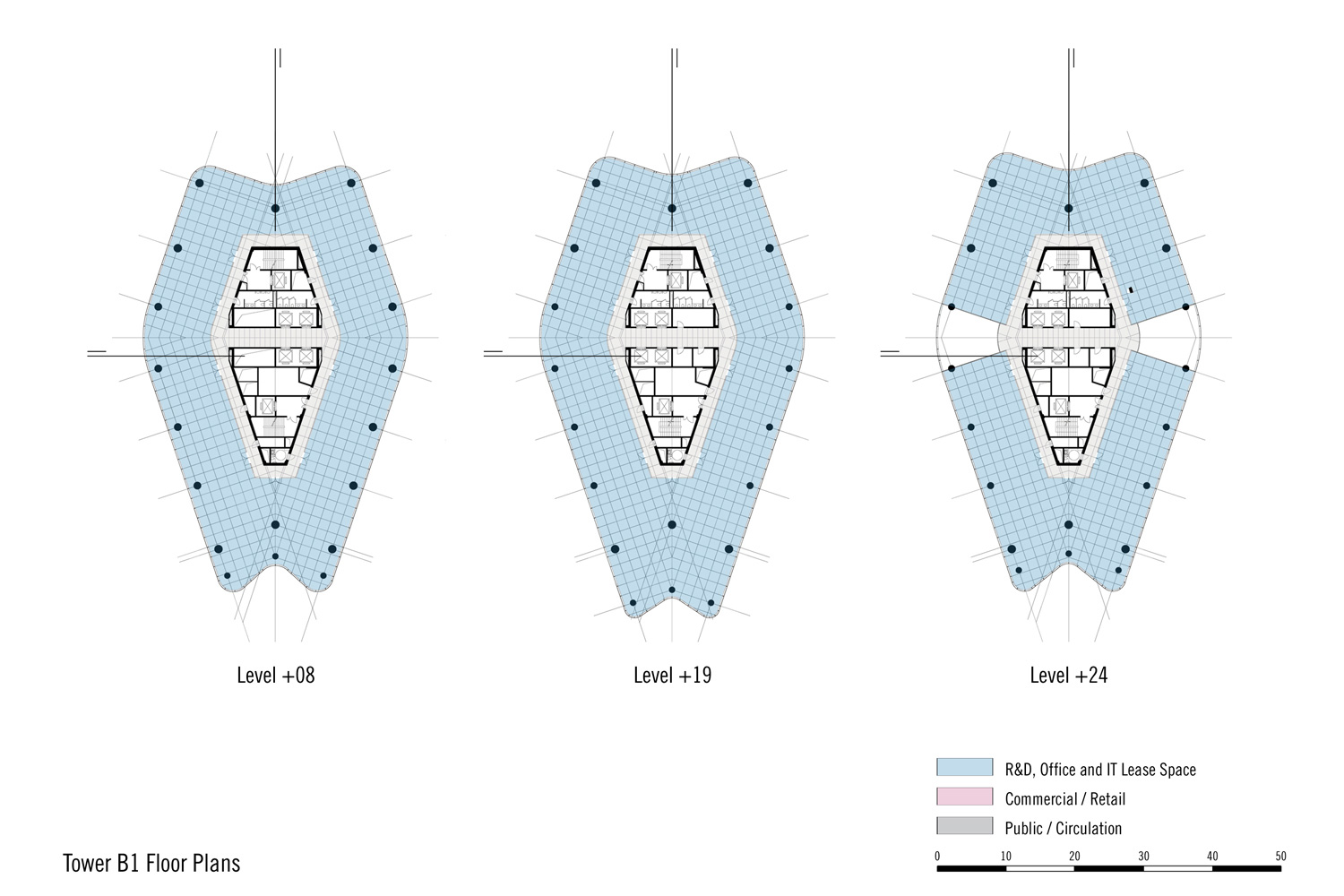 Architecturally, combinations of active and passive environmental design strategies are incorporated providing reduced operating costs, energy savings and materials conservation. The design features highly flexible planning solutions meeting the demanding criteria of functional use and programmatic adaptability required for today’s innovation workplace environments. This elegantly sinuous tower form rises 110 meters, serving as a focal point of the Technology Park and an iconic visual “marker” for the area.