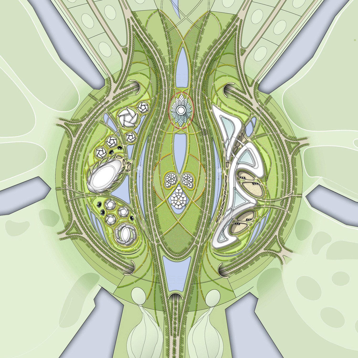 The zone is organized around a central landscaped zone, with an organic elliptical shape which flows from the island’s main southern entrance roadway, extending and linking into the northern hotel zone’s central park. Flanking the elliptical garden are respectively the conference center and the commercial & entertainment complex. Expressive organic and floral forms define the modern conferencing pavilions, which are set within an extensive garden network with specific water features.