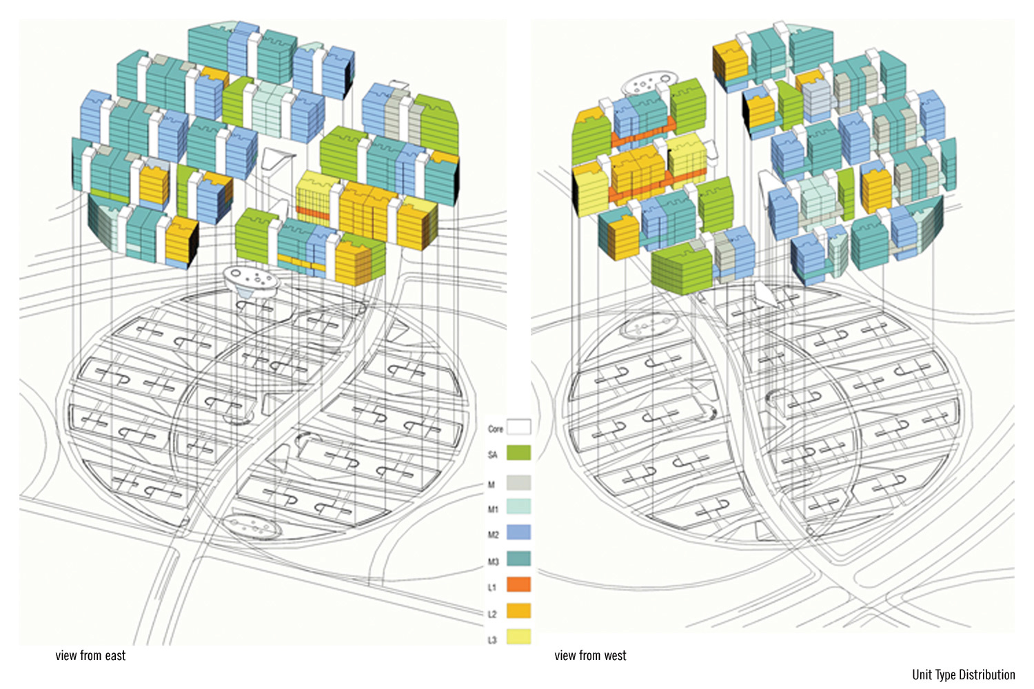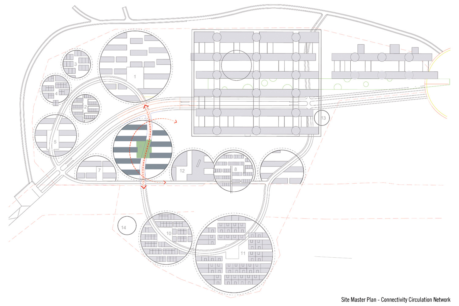 This proposal focuses on Quarter 6, containing apartment housing blocks and minimal social infrastructure. The design strategy respects the District master plan, and emphasizes direct connections with the landscape and the District’s adjacent functional Quarters. A central urban realm is framed by residential blocks and features pavilion buildings containing social infrastructure and public amenities. The residential blocks respect the master plan’s proposed north/south alignment, but provide an offset occurring at the site’s central serpentine roadway. Courtyard spaces are defined between buildings, and site circulation includes pedestrian paths parallel with the ribbon buildings, but also features a transverse route through them. This east/west path follows an arc echoing the site’s circular perimeter, and connects Quarter 6 with the adjacent Cultural Quarter, Quarter 1 and Technopark.