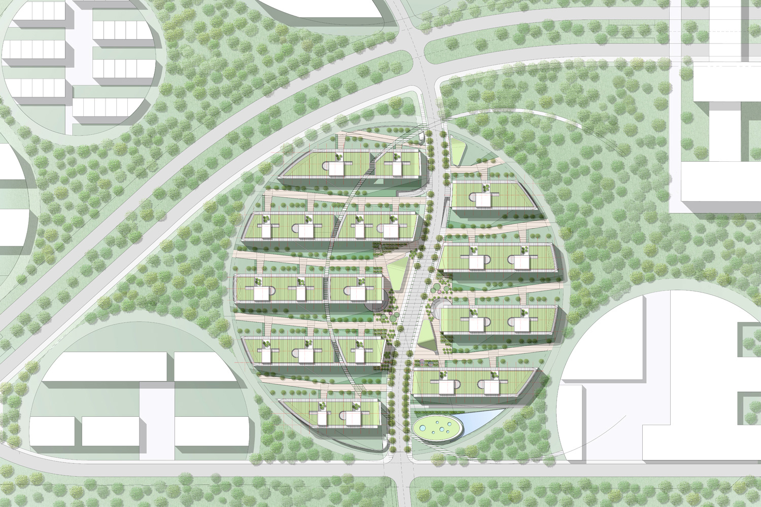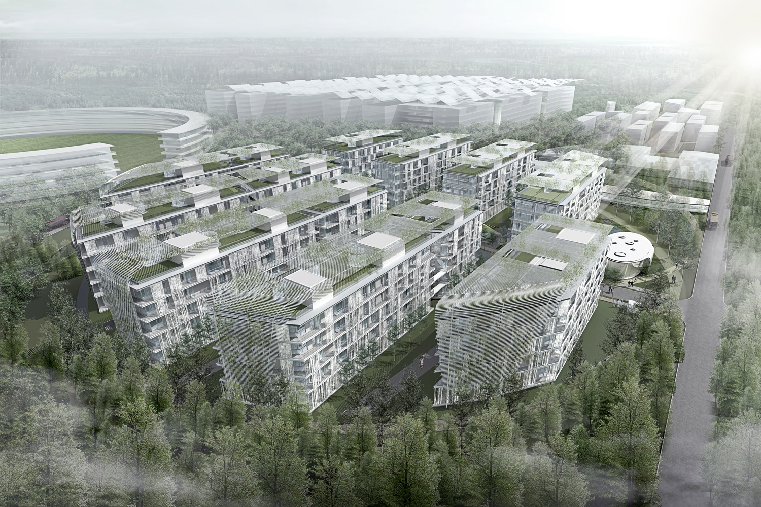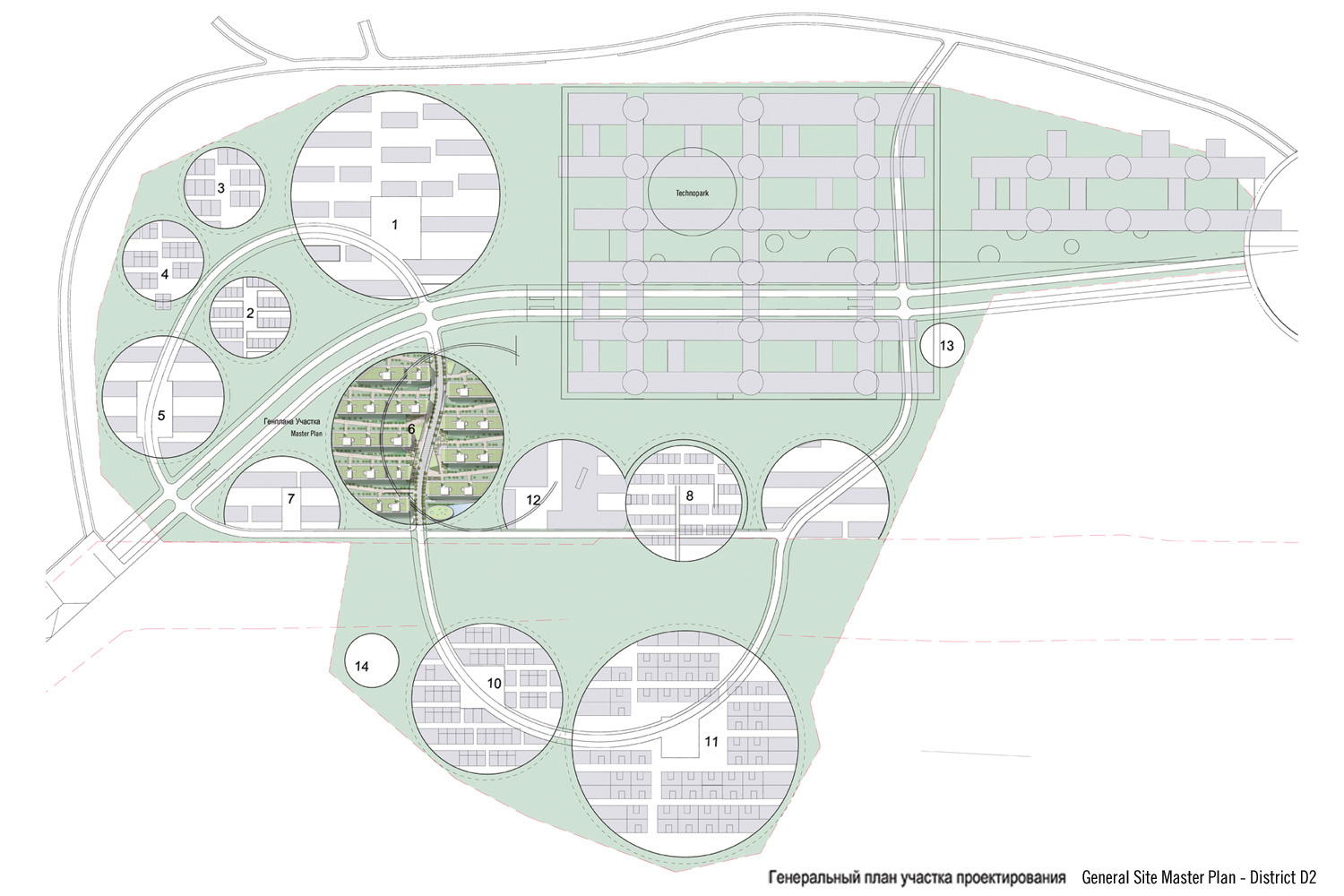 Skolkovo Innovation Centre is a strategic initiative endorsed by the Russian government to create a research and innovation hub focused upon diversifying Russia's economy by promoting global innovation in five key areas of focus: IT, Biomedical, Energy Efficiency, Nuclear Science, and Space Technology. The overall master plan has been developed by France’s AREP, and selected through international competition, whilst the specific districts have detailed master plans prepared by leading international design firms. District D2 features the Technopark functional ensemble, with a supportive urban organization of housing dispersed amongst nature. Various housing types are positioned within circles inscribed in the landscape, creating “islands surrounded by forest”.