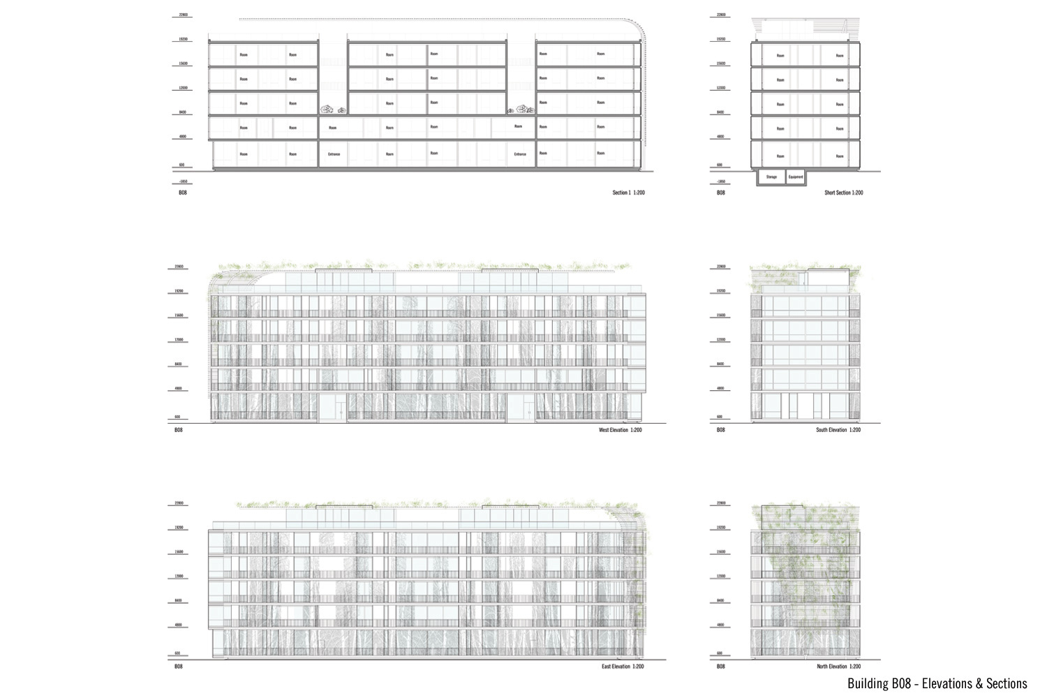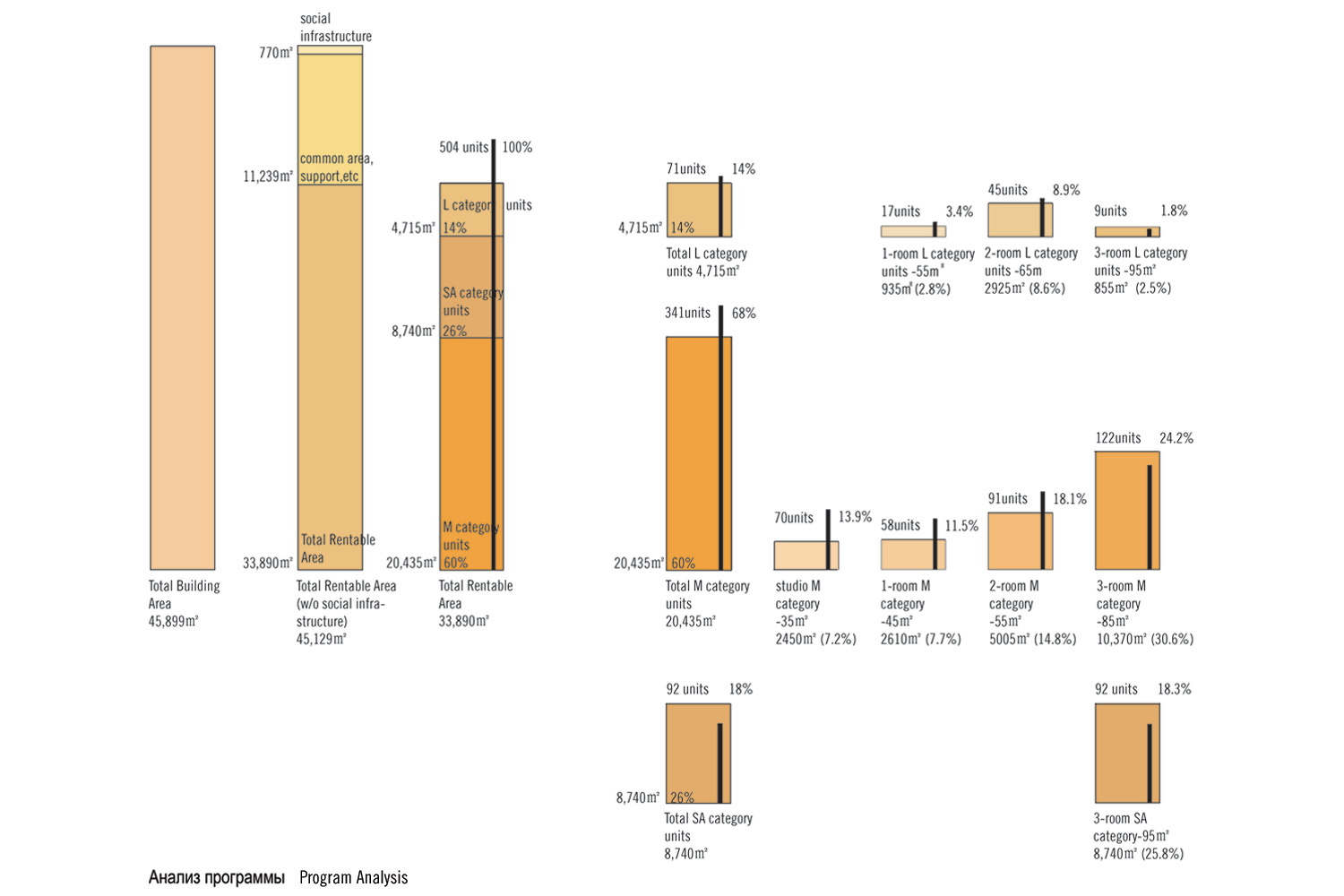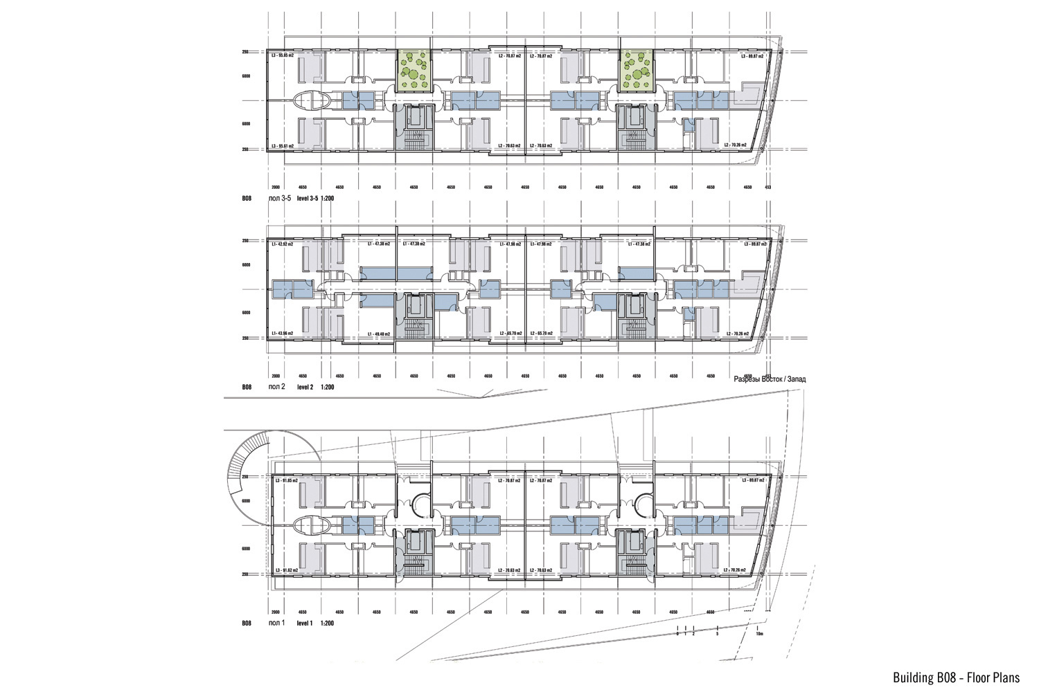 居民区项目总建筑面积45,900平方米,预计将为1200名居民提供共500多套住房。房屋样式包括1室或2室的工作间,或者是私人多居室公寓。房屋面积从30平方米到110平方米。为了实现项目效果、实施房屋分类出租策略和避免社会群体隔离,房屋被分布在不同的房屋群组合之中。居民住宅有着优良的采光和方便的连续式阳台,同时也考虑了气候和对住户隐私的保护。通过滑动印有森林图案的玻璃墙,露台可以以多种方式开闭——这实现了建筑与自然更为进一步的接触。