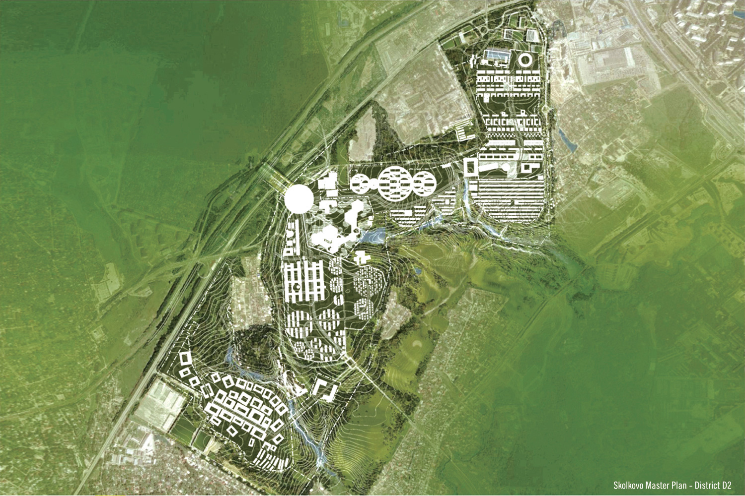 斯科尔科沃创新中心是一个由俄罗斯政府支持的战略行动计划,旨在创造一个以实现俄罗斯经济多元化为重心的研究和创新中心,该计划致力于促进信息技术、生物医学、能源效率、核科学和空间技术这五大核心领域的全球化创新。区域总体规划经过国际选拔由法国AREP担纲,各具体片区也由国际顶级设计公司提供详细规划。D2区体现了科技园的功能集成,此区域中支持性的城市房屋散布在自然环境之中。各种房屋被建造在一个个位于景观中的房屋圈内,形成了一个个森林环绕的“房屋岛”。