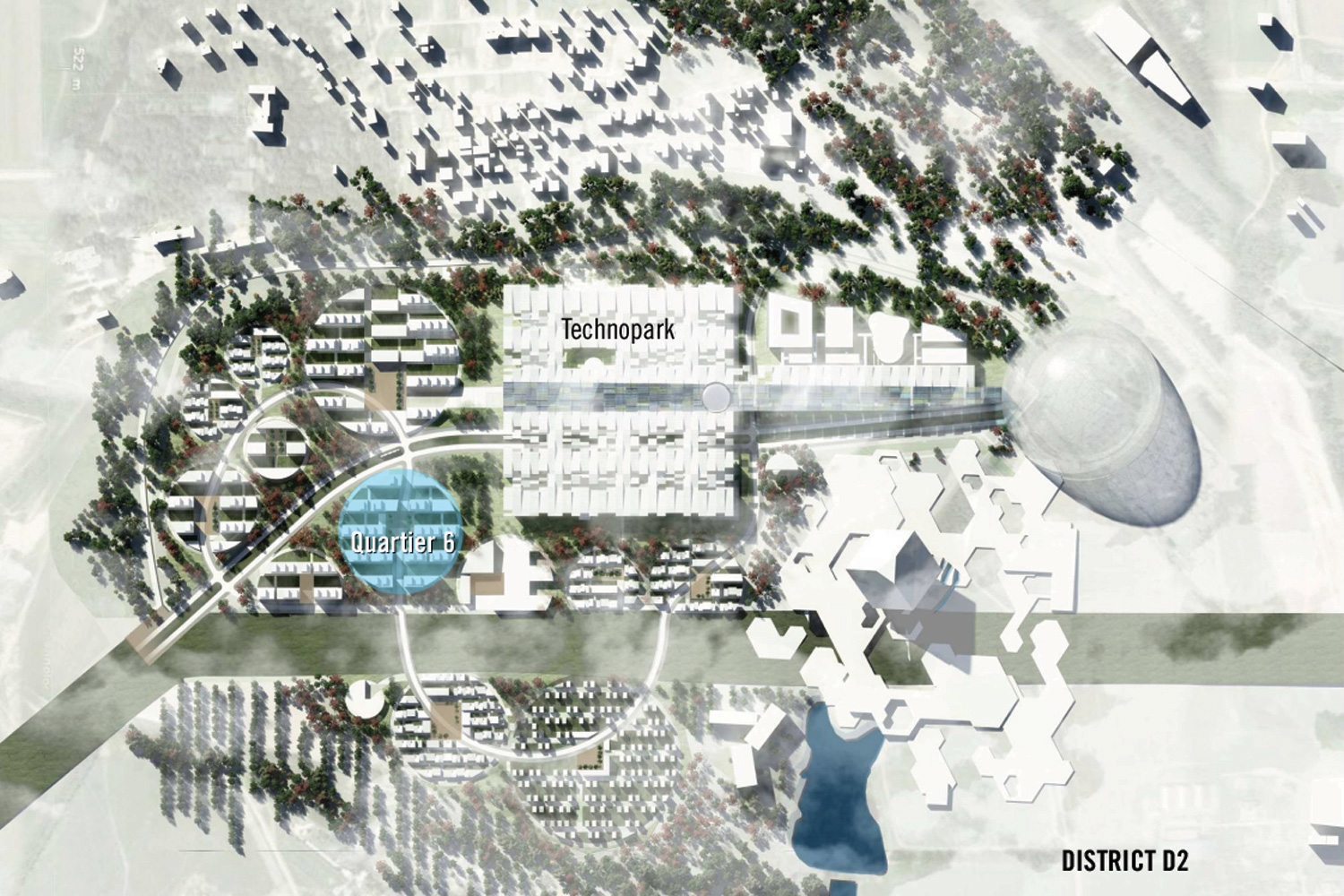此方案主要关注6号区域,方案包括住宅区和最基本的社会基础设施。此设计遵循区域总体规划,同时强调与景观和临近功能区域之间的直接连系。中心城区由居民区和包含基础设施和公共娱乐场所的场馆类建筑组成。居民区设计遵照总体规划中的南北对齐设计,但在中心曲折路段有一些偏移。建筑之间设置有庭院,区域交通由沿带状建筑平行建造的道路以及一条从中穿越的道路组成。东西环路呈弧线状,紧贴区域环形周边,同时将6号区域与临近文化区域、1号区域及科技园连接起来。